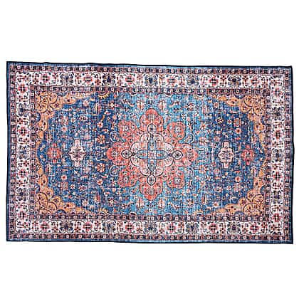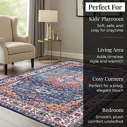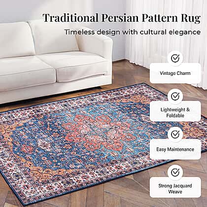Designed to instantly lift a room, this multicoloured vintage printed chenille rug adds personality through intricate Persian-style detailing. The jacquard weave delivers strength and long-lasting shape, while the cotton-blend fabric keeps the surface comfortable and breathable. Rich, layered tones create a lived-in look that pairs beautifully with both modern and traditional interiors. Finished with low-pile edges, it lies flat and tidy under furniture. The non-slip TPR backing provides a reassuring grip, making it a reliable choice for busy spaces. Its 180x120cm size works well beneath coffee tables or as a statement accent.
