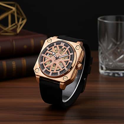 MAJESTY Automatic Mechanical 3ATM WR Rose Gold Hollow Dial - Rose Gold Case Mens Watch with Black Silicone Strap