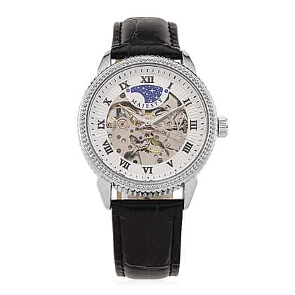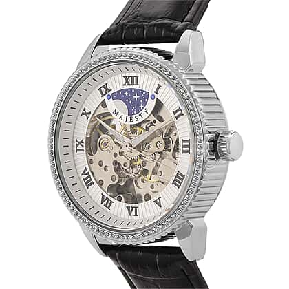 Classic sophistication meets modern engineering in this Majesty automatic mechanical watch. This timeless piece is for those who appreciate quiet luxury. Designed with precision, it features a silver-plated alloy case that frames a striking white hydraulic skeleton dial, where the artistry of exposed mechanics meets elegant Roman numeral markers. The open-heart design reveals the intricate Dandong automatic movement, capturing the rhythm of time with every turn of the wrist.The white inner ring enhances depth and contrast, while the black leather strap, finished with a stainless steel buckle, brings balance and refinement. A stainless steel case back with a glass window completes the look, adding a contemporary twist to traditional craftsmanship. With 3ATM water resistance, it’s built for both confidence and convenience. This watch can transition seamlessly from boardroom to evening affair.