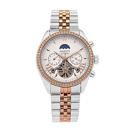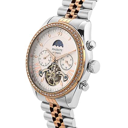 MAJESTY Multifunctional Automatic 3ATM WR White Literal Dial & Two-Tone Silver/Rose Gold Crystal Case Mens Watch with Two-Tone Stainless Steel Strap 0.01 Ct.
