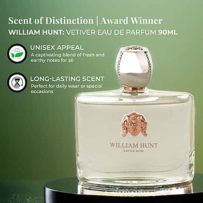 Experience timeless sophistication with William Hunt: Vetiver Eau De Parfum, a unisex fragrance that captivates with its fresh yet earthy aroma. This limited-edition scent opens with invigorating top notes of bergamot, lemon, mandarin, and neroli, transitioning to a heart of cardamom, cumin, and rosemary. Its rich base of cedarwood, amber, vetiver, and musk leaves a lingering impression of warmth and elegance. Housed in a minimalistic bottle with the brand’s iconic logo, it is packaged in an exquisite snake-skin patterned box with golden accents. Perfect for making a statement, this perfume ensures you leave an unforgettable presence wherever you go.