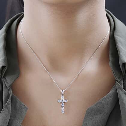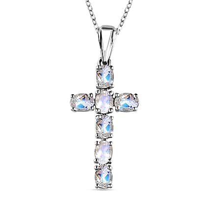 Rainbow Moonstone Cross Pendant with Chain ( Size 20) in Platinum Overlay Sterling Silver 1.169 Ct.