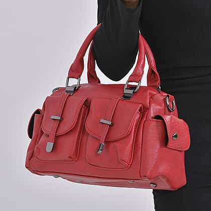 Multi-Pocket Handbag with Detachable Shoulder Strap - Red