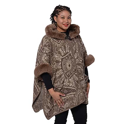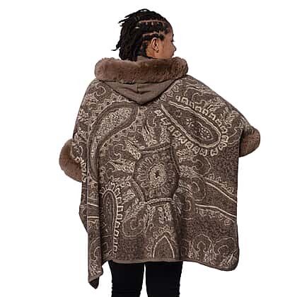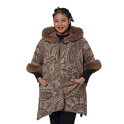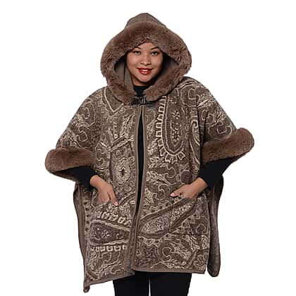Cashew Flower Pattern Long Cape with Faux Fur Hood and Sleeves (One Size) - Light Brown and Off White