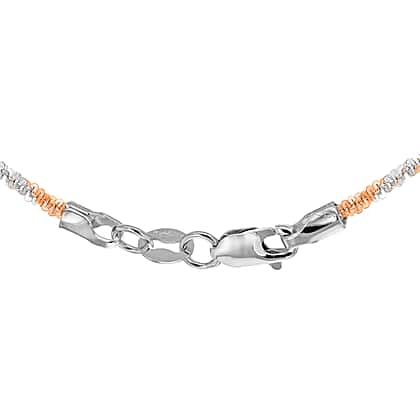 Elegant tocalle links have been woven together in this bundle of joy wrapped in the luxurious sheen of rose and white gold. The two-colour gold tocalle chain is made with 9K rose and white gold. The contrasting mix of two different gold finishes highlights the intricate Tocalle pattern made famous by Italian designers. The Chain has a necklet style and comes in a corresponding length of 16 inches. The 1.4 mm chain rests lightly around your neck bringing the spotlight on you.