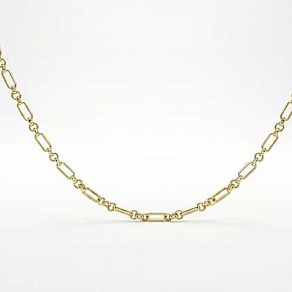 With a diamond cut accenting its sparkle, the Figaro style gets a facelift in this distinctive chain made in 5.1 grams of yellow gold. This 9K yellow gold Figaro Belcher chain features flattened links of 3.5mm alternating with a series of round links. The varying links make it a blend of the Figaro and Belcher styles, heightening the charm of its unique design. The chain measures 20 inches, a length that can be worn with a pendant, or layered with other necklaces.