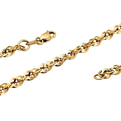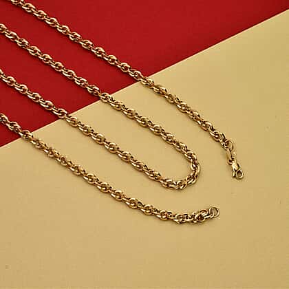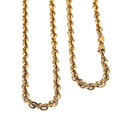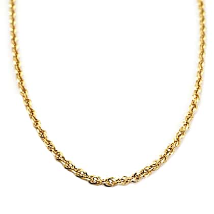 Prince of Wales, known as the Loose Rope chain, has similarities with the standard Rope chain design. A loose rope chain is made from a thinner wire shaped into rings and then interlocked into groups to create a twisted rope design. The spacing in between each link makes the chain very flexible. The chain is in 9K yellow gold.