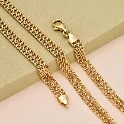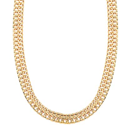The curb chain is crafted in an infinity design in a yellow gold-tone. The chain is woven by interlocking the infinity shape. The link is twisted slightly and often hammered to create a stunning flat linked chain. Each link's corners and sides have been carefully shaved at an angle to create facets that allow light to create a dazzling sparkle.