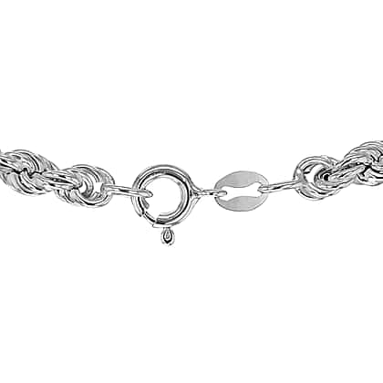 This exquisite chain comes in a rope chain design consisting of several small interlocking links that pattern a rope's shape. The style is trendy throughout the world. It is constructed of sterling silver, which gives it a strong construction and long endurance. This chain may be used with both formal and informal attire to make a powerful statement. It weighs 11.1 grams, making it lightweight and pleasant to wear for extended periods of time. It also includes a spring clasp for a quick and secure lock
