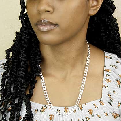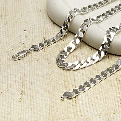 This wonderful chain has a flat square link curb design with circular links that interlock and lie flat and close together, making it suitable for both men and women to wear and style. The sterling silver chain is expertly fashioned, resulting in a necklace with a strong structure and a gleaming finish. It's only 33.3 grams, making it comfortable to wear all day. It includes a secure and easy-to-use lobster clasp. It is 56cm long and is designed to draw attention to your collarbone.