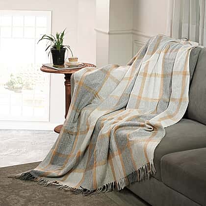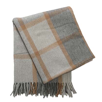 Checkered Pattern Wool Throw Blanket with Fringes and is Anti-Wrinkle, Soft and keeps you warm for read time on couch or lounger and while travelling - Grey and Rust