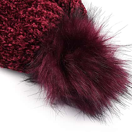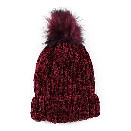 Chenille Cable Ladies Bobble Knit Hat - Purple
