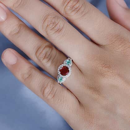 Cherry Fire Opal, Emerald & White Zircon Ring in Rhodium Sterling Silver 1.24 ct