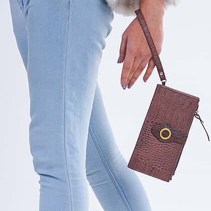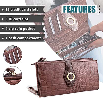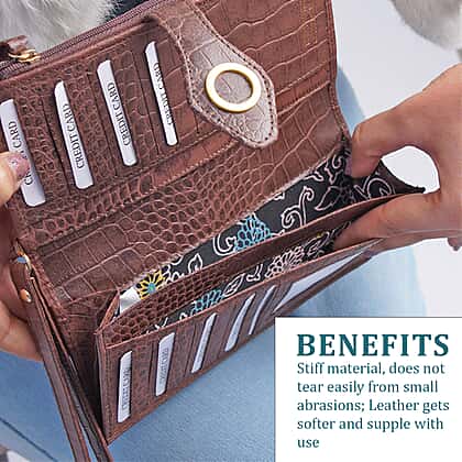 Chic Boutique- 100% Genuine Leather Croc Embossed RFID Protected Wallet with 15 Card Slots & Leather Wristlet - Brown