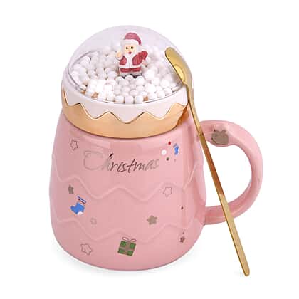 Christmas Ceramic Coffee Mug with Metal Spoon (470ml) - Pink