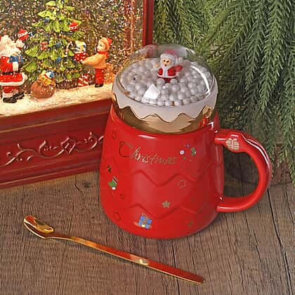 Christmas Ceramic Coffee Mug with Metal Spoon (470ml) - Red