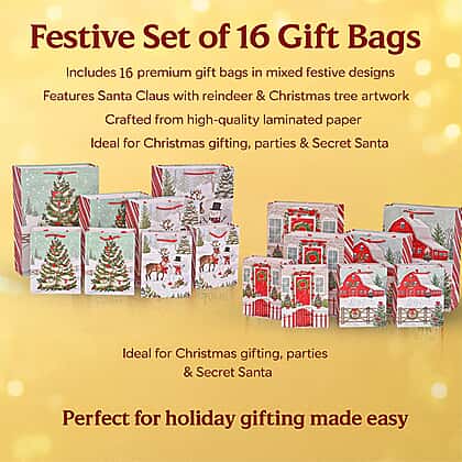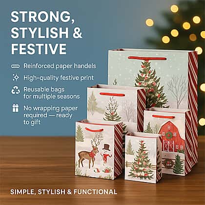 Celebrate this festive season in style with these sets of 16 Christmas-themed gift papers, adding fun to every present you give. The gift bag features a christmas tree and house, reindeer, and snowflakes, capturing the beauty of the holidays and festive season in multi-color prints. Each sheet captures the charm of the coming festive season, from Santa to playful reindeer, wreaths, and snowflakes, making it a striking paper gift that matches the Christmas vibe. These sets of paper bags are perfect for holding your present for your loved ones for the coming season. Give your loved ones this thoughtful surprise and make your festive season memorable.
