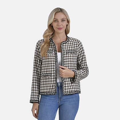 - Elegant brown & white checkered tweed design for a classic yet modern appeal.