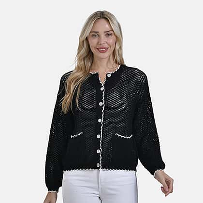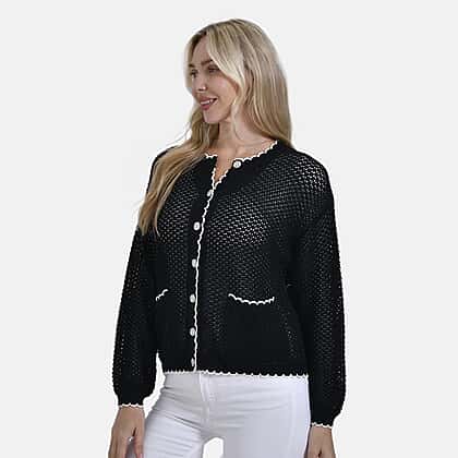 Simple and refined, the La Marey Black Knit Cardigan offers a versatile layer for a range of looks. The deep black tone is enhanced by cream contrast trim along the edges and pockets, giving it a subtle lift. Crafted from a cotton-polyester blend, it features a translucent knit texture, round neck, and long sleeves. A full front button closure and two front pockets add practical finishing touches to this everyday essential.