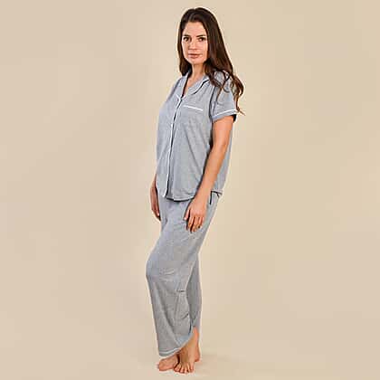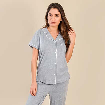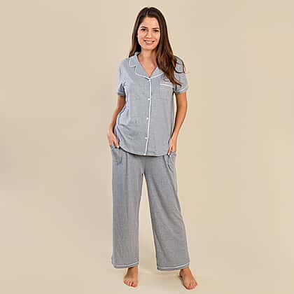 Style yourself in soft and sweet sleepwear to start and end your day in comfortable style with this super-soft notch collar pyjama set for women from Tamsy. Solid colour with contrasting pining gives a minimalistic appeal to this women's pyjama set. Button closure shirt and pull on pyjamas make this 2-piece set easy to put on and take off.