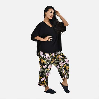 This soft and comfortable two-piece pyjama set from Tamsy is a must-have addition to your wardrobe collection. Comes with a v-neck top with elbow-length sleeves and an elasticated waist for a relaxed fit. This is perfect for outdoor and indoor lounging.