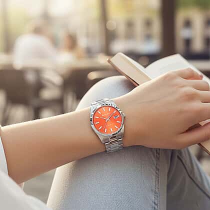 - Vibrant orange sunray dial for a distinctive look.