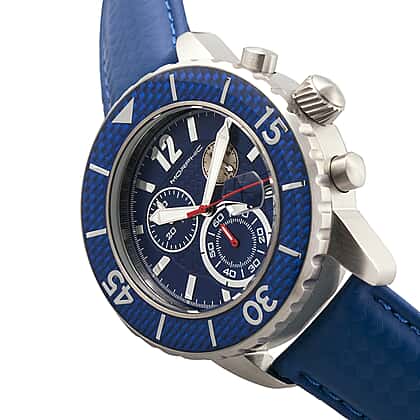 Balancing sporty detailing with a clean, modern look, this Morphic M51 Series men’s watch combines a textured blue carbon-pattern dial with a sleek silver-tone stainless steel case. The Japanese Miyota JS05 quartz movement keeps time confidently, while the full chronograph display and magnified date window enhance practicality. Its uni-directional rotating carbon-fibre bezel reinforces durability and adds a dynamic finish to the design. Luminous hands offer easy visibility, and the blue genuine leather strap ensures comfort throughout the day. With 10ATM water resistance, it’s a dependable choice for men who value style and lasting performance.