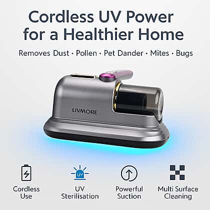 Livmore Cordless UV Bed Vacuum Cleaner - Removes Dust, Pollen, Pet Dander, Mites and Bugs for beds, sofas, carpets and fabrics