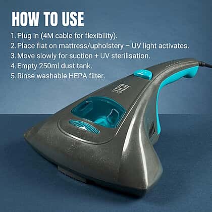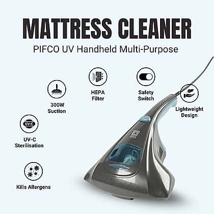 Keep your home fresh and hygienic with the PIFCO UV Handheld Multi-Purpose Mattress Cleaner. Designed with a built-in UV-C light, this clever cleaner effectively eliminates bacteria, dust, and mites from mattresses, sofas, and upholstered furniture. The vibrating head agitates deep-set debris while the powerful 300W suction captures everything into a 250ml dust container. Lightweight at just 1.3kg, it’s easy to manoeuvre and ideal for quick yet thorough cleaning. The addition of a HEPA filter ensures cleaner air, making it perfect for allergy sufferers. Compact, efficient, and easy to store, it’s your new secret to a cleaner, healthier home.