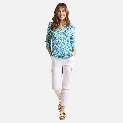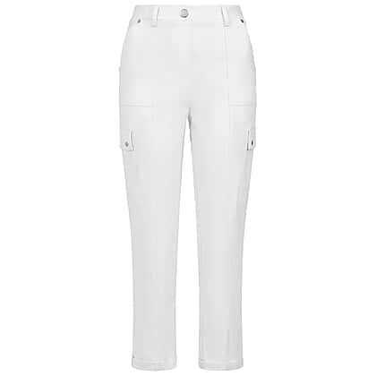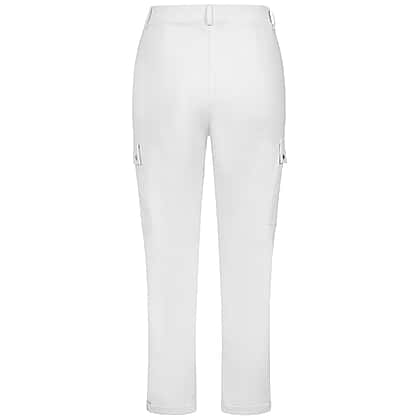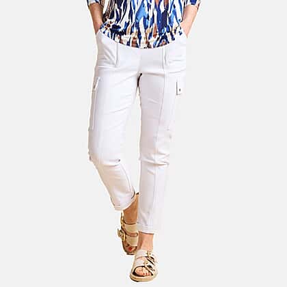 Refresh your wardrobe with these Emreco combat style stretch utility Bengaline trousers in white. Perfect for warmer days, these slim-fit trousers offer a sleek, contemporary silhouette while keeping you comfortable throughout the day. The stretch bengaline material provides flexibility and structure, ensuring a flattering fit that moves with you. Designed with practical details like multiple pockets and a secure button and zip fastening, they strike the perfect balance between smart and casual. Pair them with a printed blouse or relaxed tee for a polished, versatile look that works for any occasion.