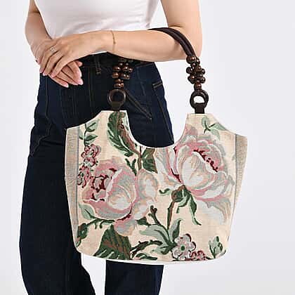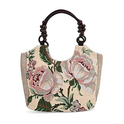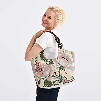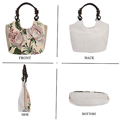 Rose Floral Print Jute Tote Bag - Beige & Rose