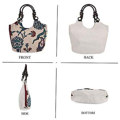 Flower Print Jute Tote Bag - Light Yellow & Blue