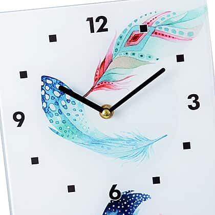 - Detailed and designer rectangular wall clock with a colourful pattern of feathers