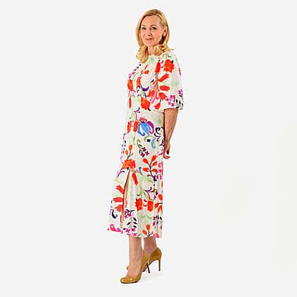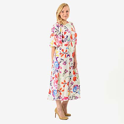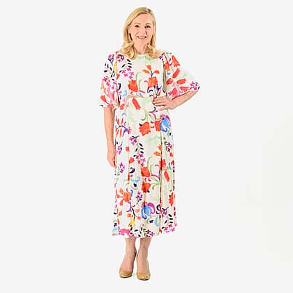 Bring a splash of colour to your wardrobe with the Maria Kaneva abstract floral print midi dress. Made from 100% viscose, this lightweight and breathable piece feels soft against the skin, offering both comfort and sophistication. The boat neckline adds a timeless touch, while the flowy silhouette and midi length create a flattering, feminine look. Featuring short flared sleeves and a vibrant floral design, it’s perfect for warm-weather days, garden parties or relaxed weekend outings. Pair it with sandals or heels for a polished finish that’s effortlessly chic and full of personality.