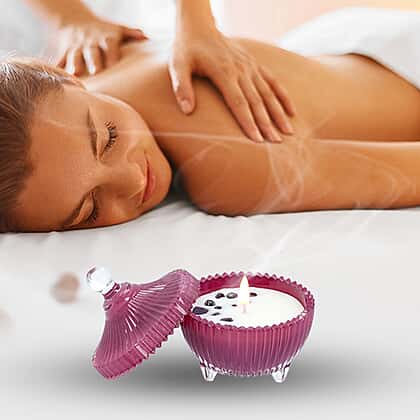 - EXTERIOR DESIGN: The candle is designed with a crown like design in a purple coloured glass with stripes for an ethereal look