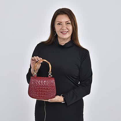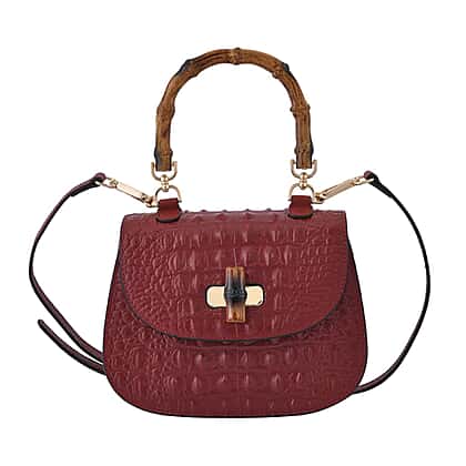 Closeout Deal - Premium Quality Leather with Bamboo Style Handle Handbag - Burgundy