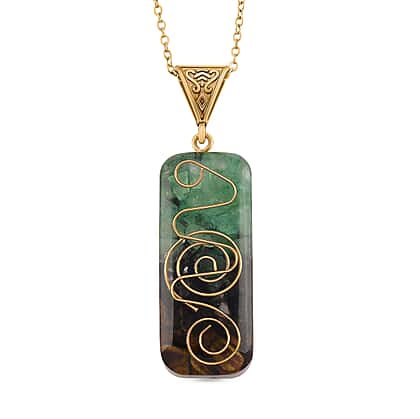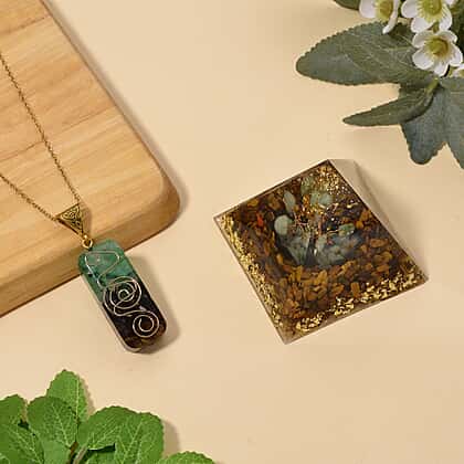 Warm earthy tones meet shimmering detail in this multi-colour gemstones pyramid and pendant set. The transparent resin pyramid highlights yellow tiger eye, green aventurine and blue sandstone arranged in a layered design that catches the light from every angle. Its matching pendant mirrors the same gemstone mix and features pure yellow gold tone wirework for an elegant finish. The 20-inch chain with a 2-inch extender offers easy length adjustment, making this set a lovely option for adding colour and character to your styling and home.