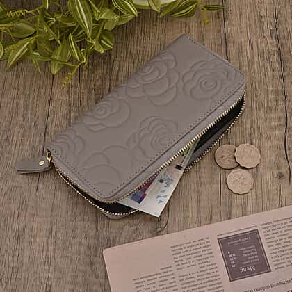 Closeout Deal - Genuine Leather Flower Embossed RFID Protected Purse (Size 19x10x2 cm) - Grey