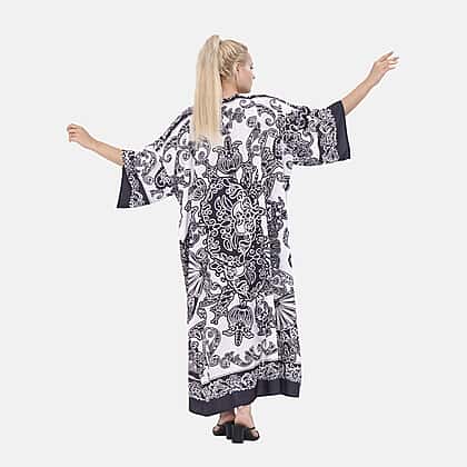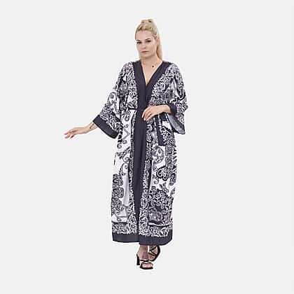 Wrap yourself in the versatile style of our 100% Polyester Patterned Kimono. This long, printed cover-up is perfect for enhancing your beach attire or adding a layer of elegance to your summer look. With a design that promises protection from the sun's rays, it doubles as a fashionable bathrobe. Its vibrant print, flowing sleeves, and V-neck cut celebrate a relaxed yet stylish silhouette, ensuring comfort with its breathable fabric. Measuring 88 x 135cm, it’s a statement piece that effortlessly complements any outfit.