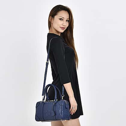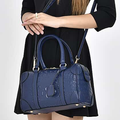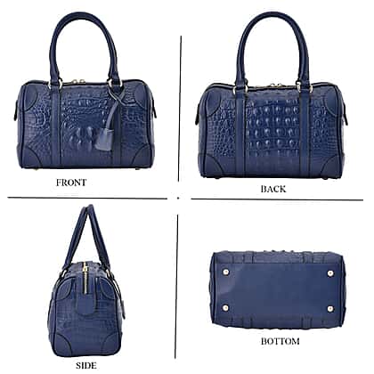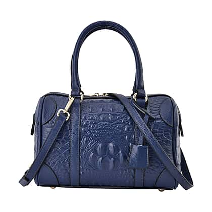 Closeout Deal Genuine Leather Crocodile Embossed Boston Bag with Detachable Long Strap & Handle Drop - Blue