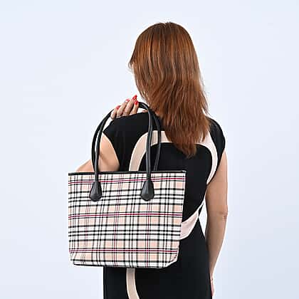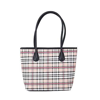 Closeout Deal Plaid Pattern Tote Bag with Shouder Strap (Size 30x29x12 Cm) - White & Beige