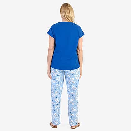 100% Cotton Ladies Flower Print T Shirt & Pants PJ Set (Size - M) - Blue