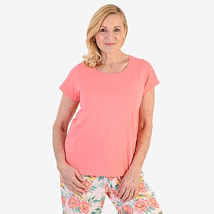 100% Cotton Ladies Flower Print T Shirt & Pants PJ Set (Size - XL) - Peach