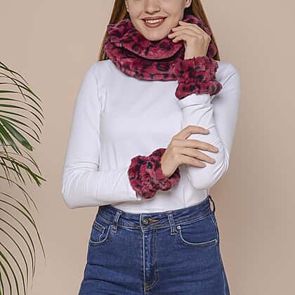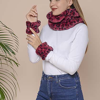 2 Piece Set - Leopard Skin Pattern Faux Fur infinity Scarf and Hand Cuffs in Wine