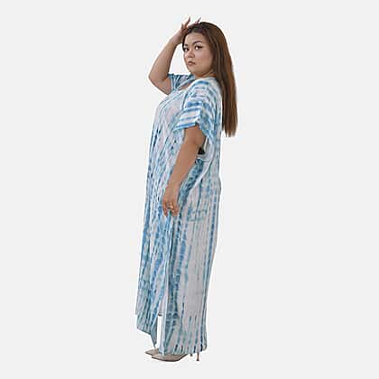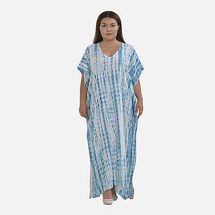 Closeout Deal 100% Viscose V-Neck Tie-Dye Stripe Pattern Mid-Sleeve Dress (One Size) (8 TO 20) - Blue - White