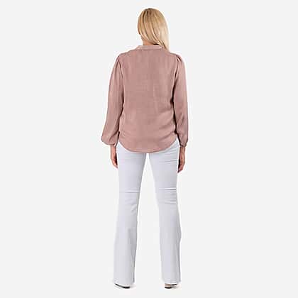 The Solid Flair Frill long sleeves top brings a graceful touch to any wardrobe with its soft dusty pink hue and flowing silhouette. Made from 100% polyester, it offers a lightweight and comfortable feel, perfect for everyday wear. The V-neckline with a mandarin collar adds an elegant charm, while the front ruffle motif gives it a stylish, feminine flair. The long sleeves feature elasticated hems, creating a gently gathered effect for a polished look. Whether paired with jeans for a relaxed feel or tailored trousers for a refined outfit, this versatile top is a must-have for effortless styling.
