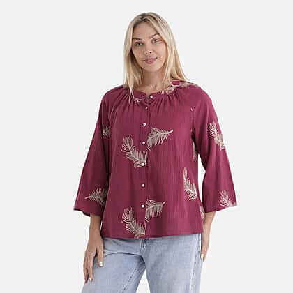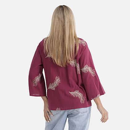 Bring comfort and detailed craftsmanship together with this La Marey cotton embroidery long-sleeve blouse, designed for breathable wear and effortless styling. The rich red base is enhanced with embroidered motifs that add texture and visual definition without overwhelming the design. Made from cotton, the fabric supports airflow and helps maintain comfort throughout the day. The relaxed fit allows ease of movement, while the wide sleeves provide added room and a soft drape. The length and cut make it easy to wear untucked or partially tucked, depending on your styling preference. Suitable for everyday wear, this blouse pairs well with denim, trousers, or skirts, offering a practical yet styled option for casual settings.