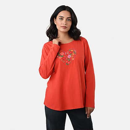 La Marey Cotton Floral Heart Embroidered full Sleve T-Shirt (Size S, 8 to 10) - Red