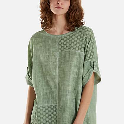Mizumi Stone Wash Patchwork Sparkle Round Neck Top (Size S-M, 8 to 12) - Green