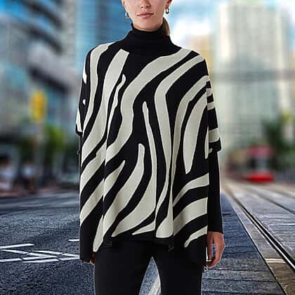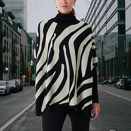 Always be party ready with this zebra roll-neck poncho. This poncho features a black and white pattern, with a high roll-up neck and soft fabric. You can pair it with jeans, jeggings and a vest top to complete the look of your outfit.